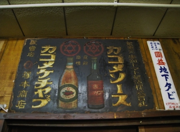 壱弐参横丁のネオレトロな居酒屋さんにありました。居酒屋さんの看板というよりは、骨董品として買って飾りにしているんだとは思います。 それより元々この看板を持っていた塚本商店さんは、この金文字のカゴメの看板を掲げているというとこが、当時は相当なステータスシンボルだったんだろうな〜、と思いました。メーカーと販売店の信頼関係の証、かっこいい。