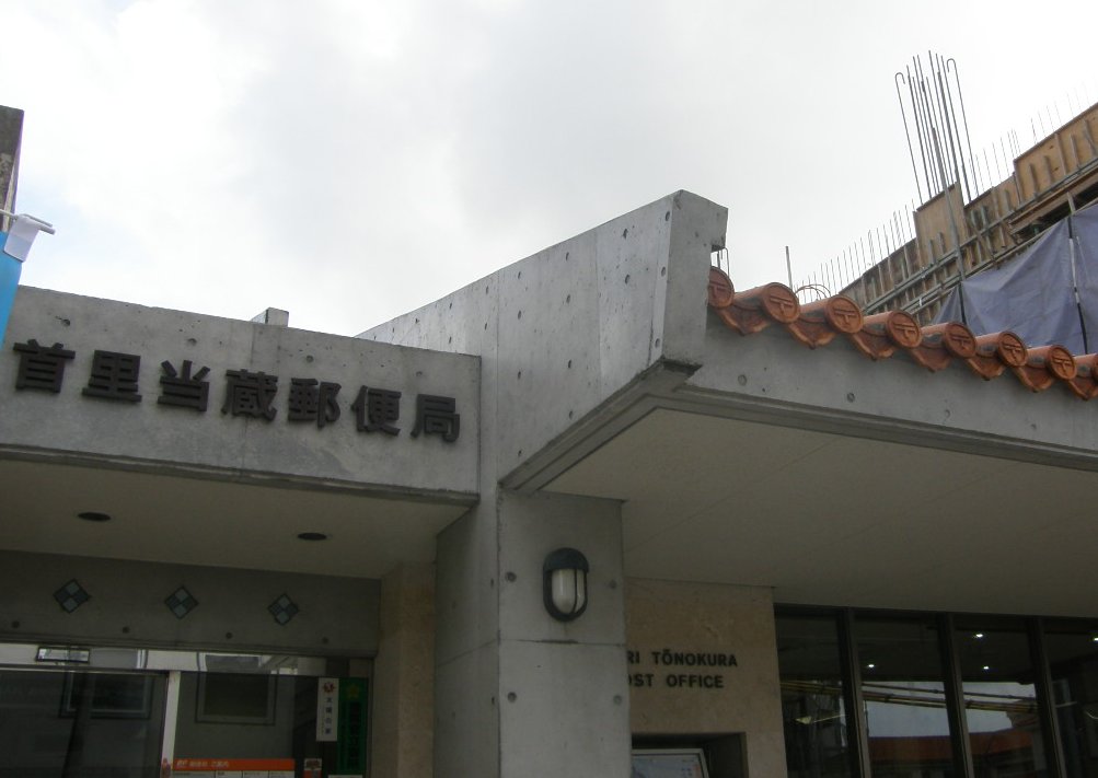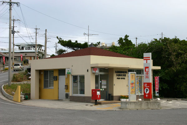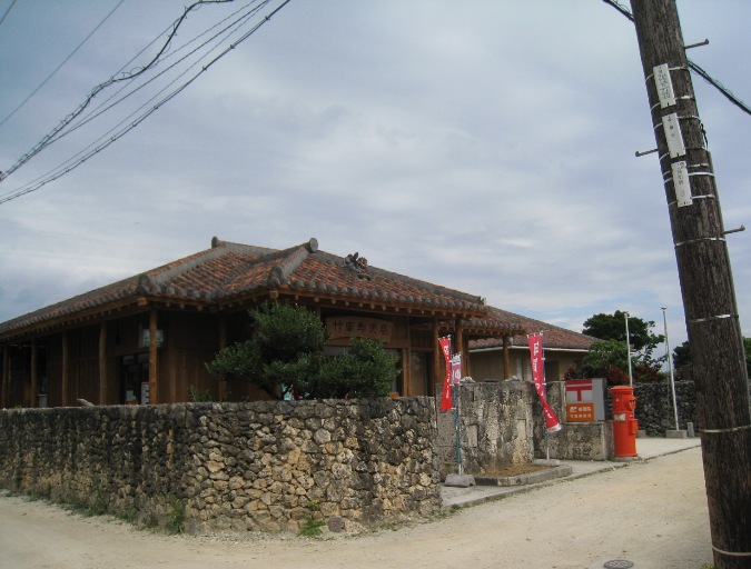 全景が無くてごめんなさい。一年半ほど前の写真です。 コンクリート打ちっ放しの、何の変哲も無い局舎だった記憶が在りますが、沖縄ならではの赤瓦に郵便マークが附けられている…のを見た瞬間、色々と、ご当地らしさの意匠に、思わず関心(歓心)しきり…でした。
