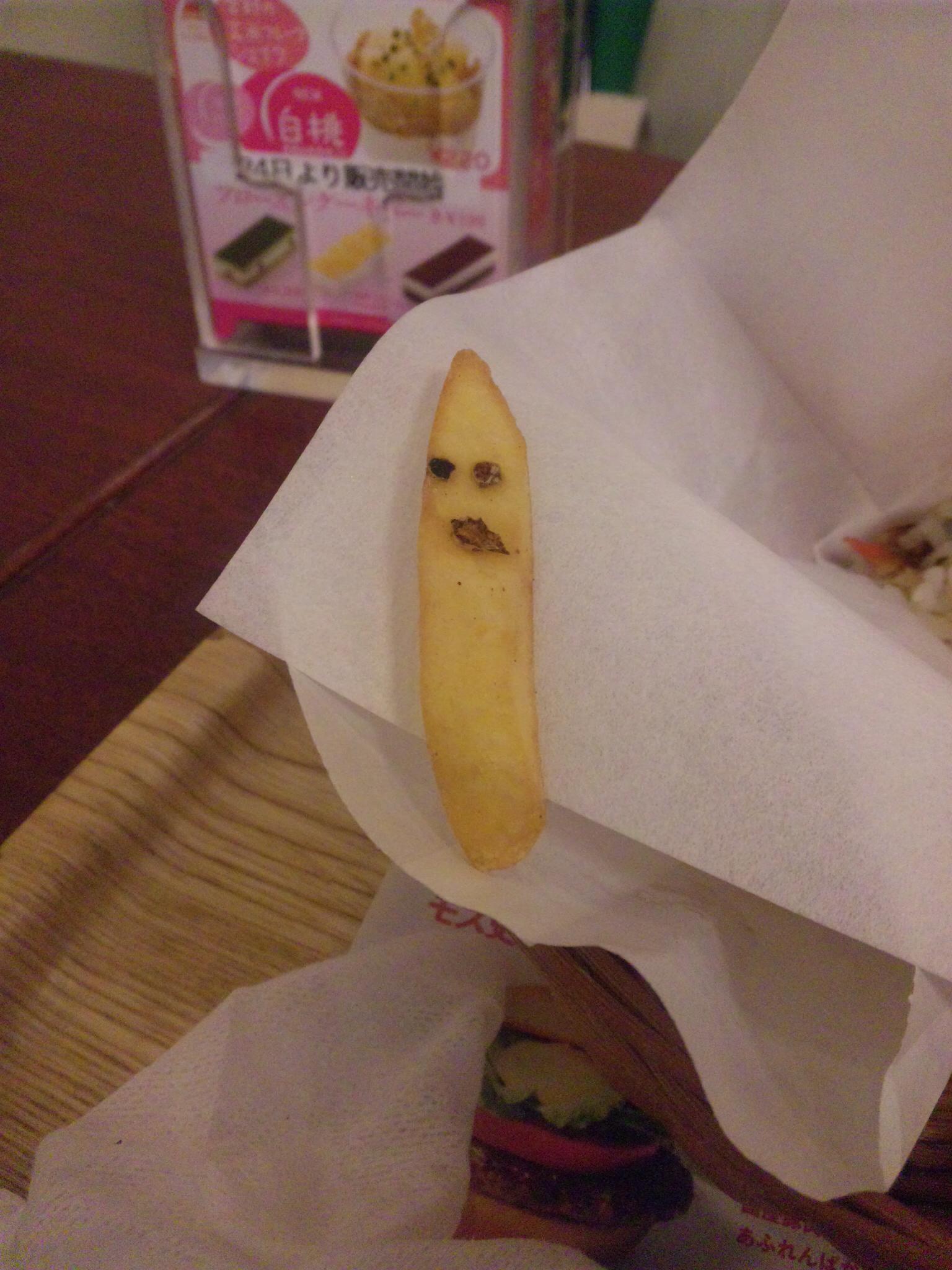 新橋のモスバーガーにて、夜ごはんを食べている最中でした。 ただならぬ緊迫した雰囲気を感じて、つまんだポテトを見て見ると… ポテトからしたら「食べられる!!!」みたいなカンジでしょうか。 美味しくいただきました。