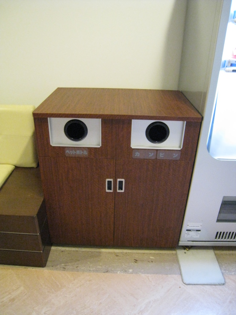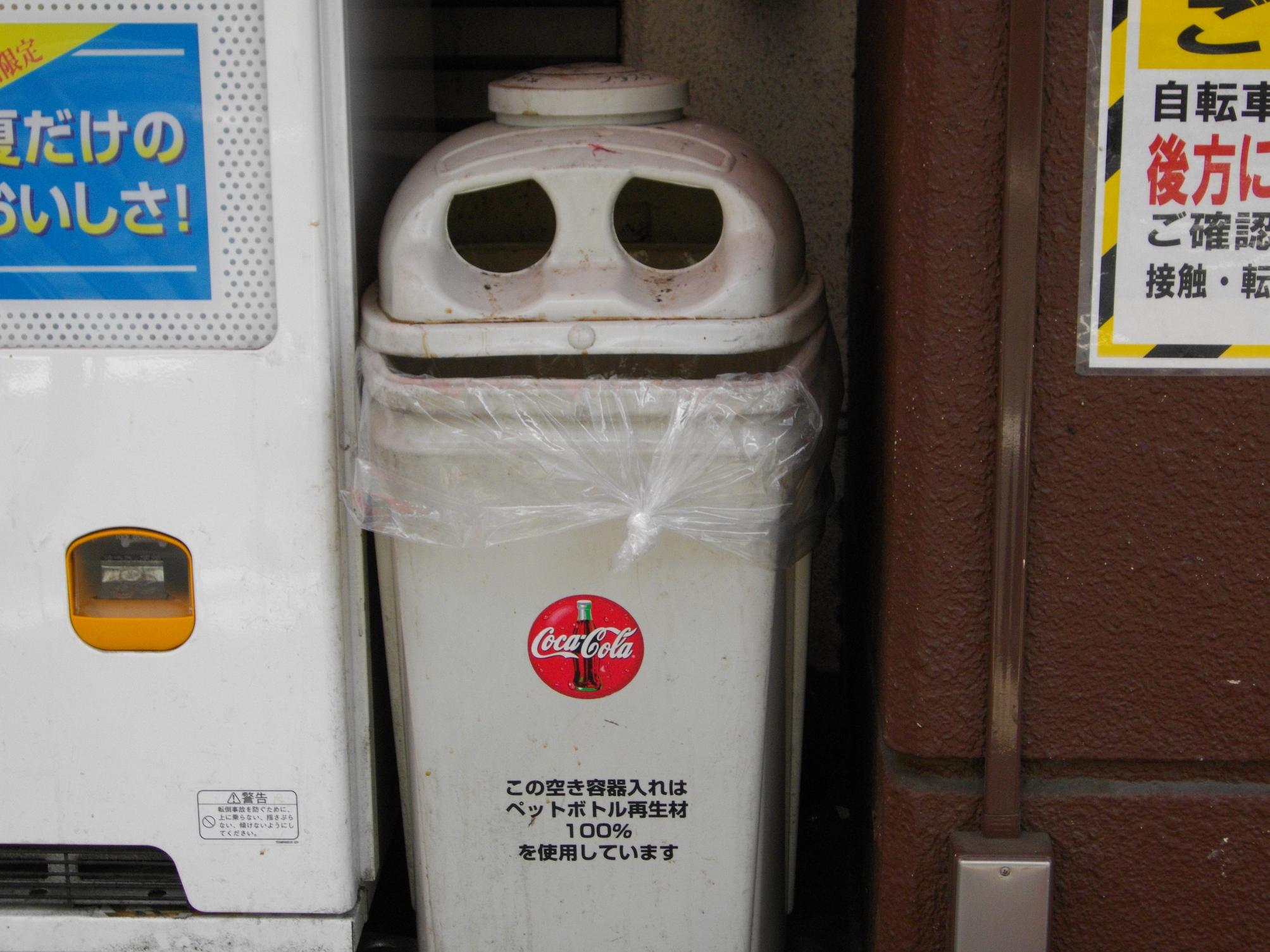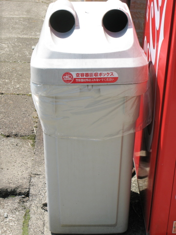 自動販売機群のそばのゴミ箱です。 表情だけで言えば、ハロウィンの飾りみたいです。