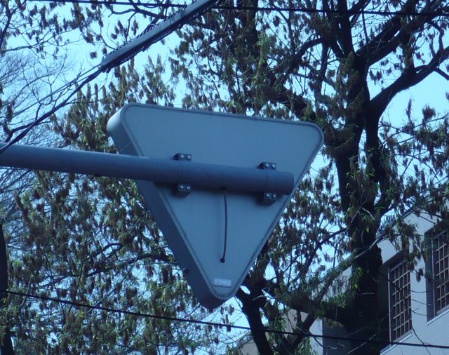 「止まれ」の標識の裏側です。 顔出しはマズイっていう写真の目の所に棒一本 そんな感じです。 仕事場のちょうど目線の所にあるのでいつも見張られている 感じがします。