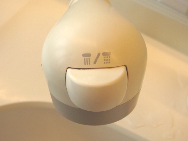 洗髪シャワーのついた洗面台の水栓が、なんだか青ざめた表情をしてました。