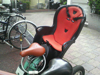 自転車用チャイルドシートが、おどけた酔っ払いのように見えます。 ちなみに自転車も、飲酒運転は絶対ダメです。