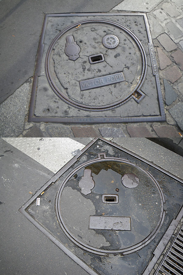 フランス、パリのマンホールです。 ロボット、若しくはテクノっぽい感じです。私は何故か映画「時計仕掛けのオレンジ」を思い出しました。 初めに一つ見付けて「おっ、珍しい顔のマンホール発見!」と撮ったのですが、この型のマンホールはパリ中に多数存在するのが後になって判りました...。 下の写真の左の方には、パリ名物メトロの切符が落ちているのも写っています(昔は長年薄緑だったのが薄紫に替わり、何年か前に白い切符になりました)。