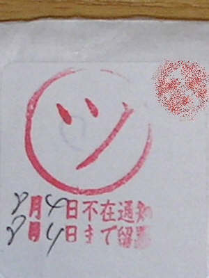 郵便物を整理してたら、昔の不在持ち戻り通知のハンコがスマイリーのごとく…。