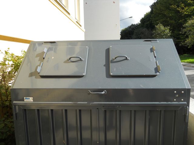 ドイツ、リューベックの街中で見かけたゴミコンテナ。四角いメガネの人がにっこり笑ってるようにしか見えず思わず写真を撮りました。