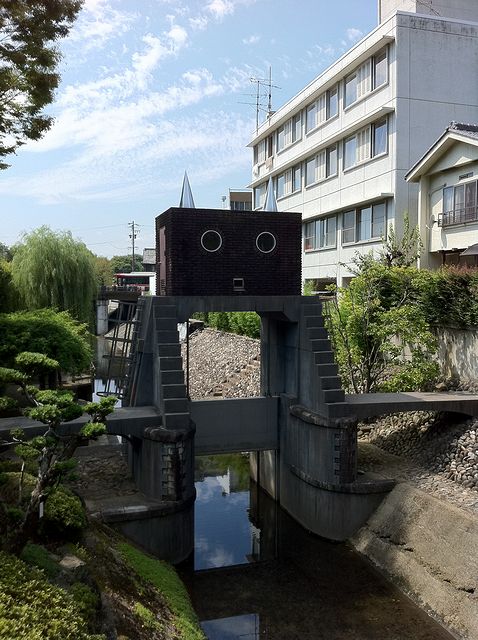 岐阜市の岐阜公園近くにあるロボット水門です。 角は改修工事の際に付け加えられたらしいです。