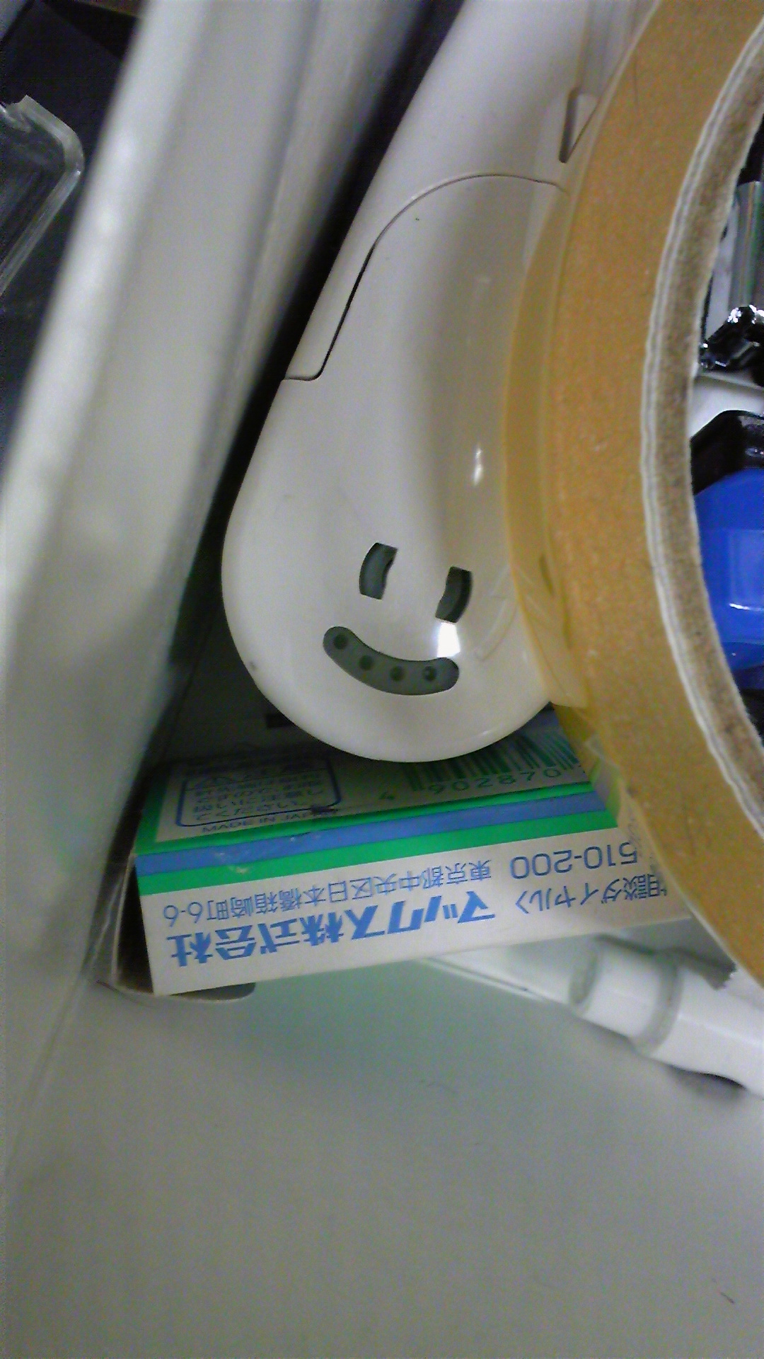 引き出しを開けたらコンニチワ。。。 何かと思ったら、修正テープの裏面でした。 よい笑顔。