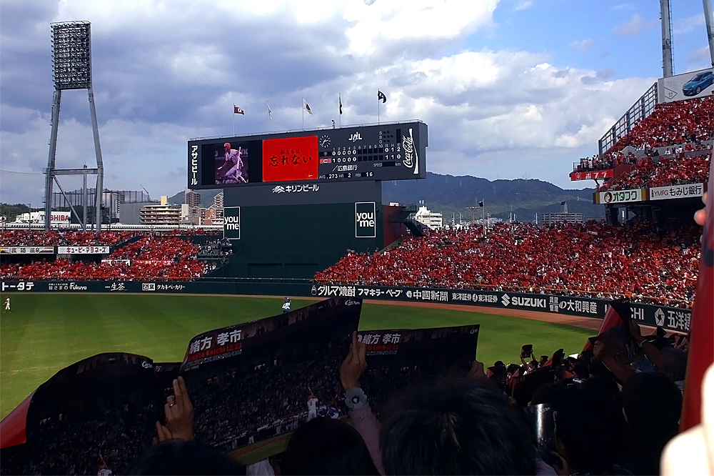 広島県民にとっては 赤=カープ の色ですね。 大物選手の引退や、記録のかかった試合の時には球場全体が赤一色に染まります。 写真=2009年10月10日 緒方孝市選手の引退試合の光景