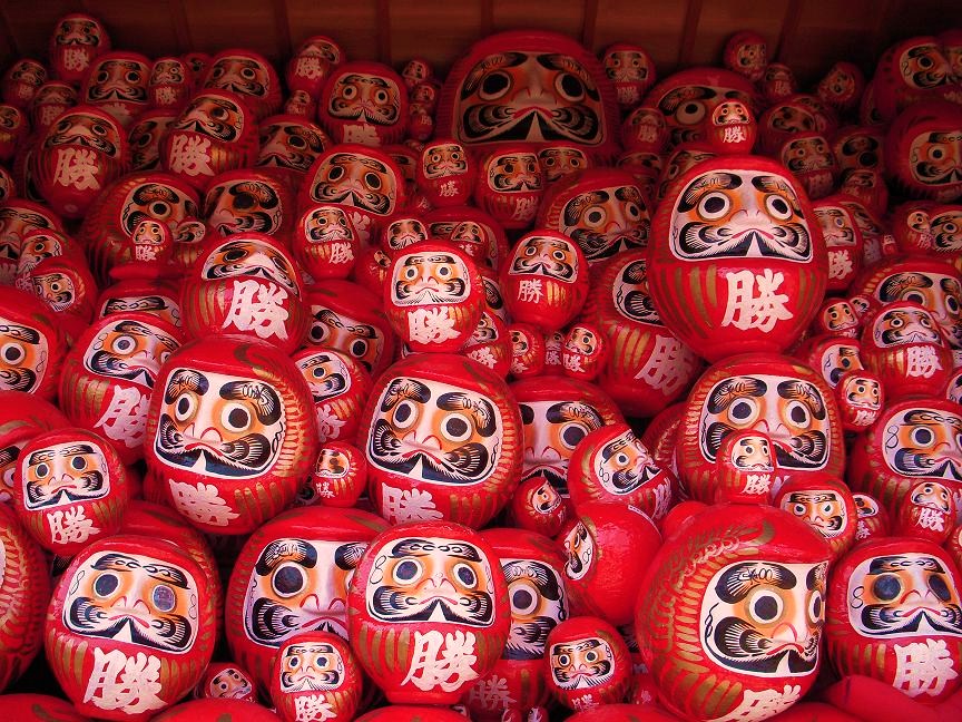 先月行きました大阪府箕面市にあるお寺、勝尾寺の勝ちだるまです。 勝尾寺は勝ち運の寺として知られ、あらゆる「勝負」に勝つことを祈願してにこのだるまが奉納されます。 よく見ると大小さまざま、みんな違う表情でおもしろいです。