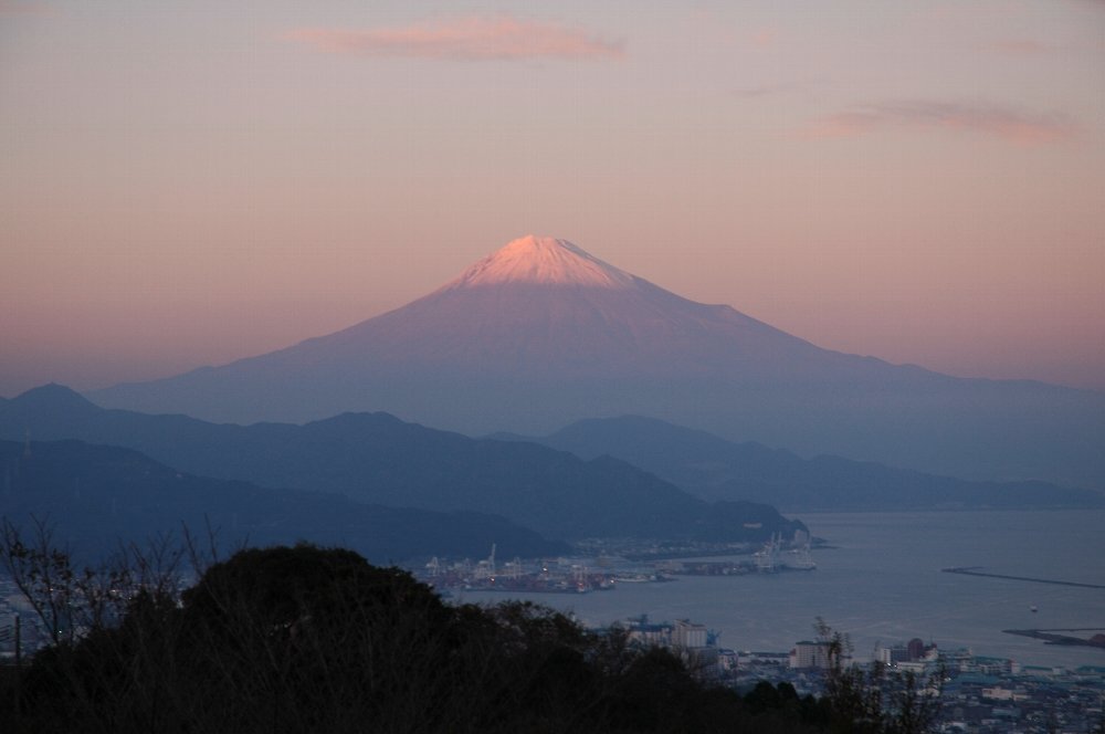 静岡市の日本平から見た赤富士です。 この日は風が強くてきれいに富士山が見えました。 とってもきれいな赤富士でしたがカメラマンの腕が 下手なのであまりきれいに撮れていなくてすみません。 下に見えるのは三大美港の一つ清水港です。