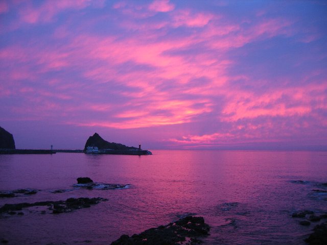 ウトロの海岸から見た夕焼けです。 実際はここまで赤く無かった気がします。 カメラのいたずらかも?