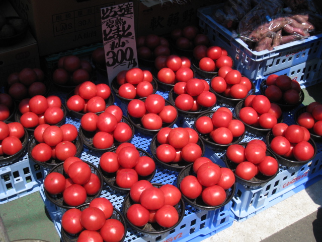 朝市のとあるお店のかご盛りのトマトのところにだけ、スポットライトが当るように日が射しこみました。