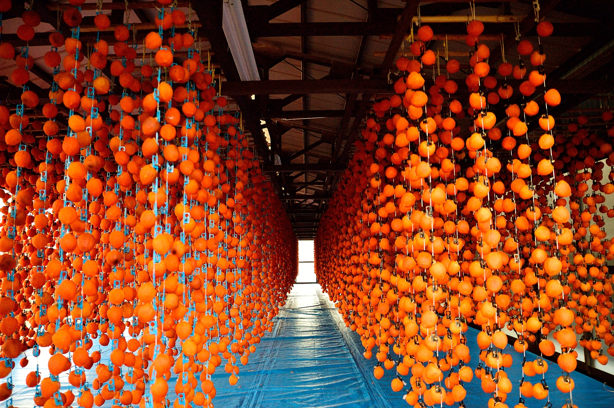 以前、親戚の家で干し柿を作っている様子を撮らせてもらった写真がありましたので投稿します。自分に写真スキルがあればもう少しキレイに撮れるんだろうなあと思いつつ。 赤というよりは朱でしょうか。