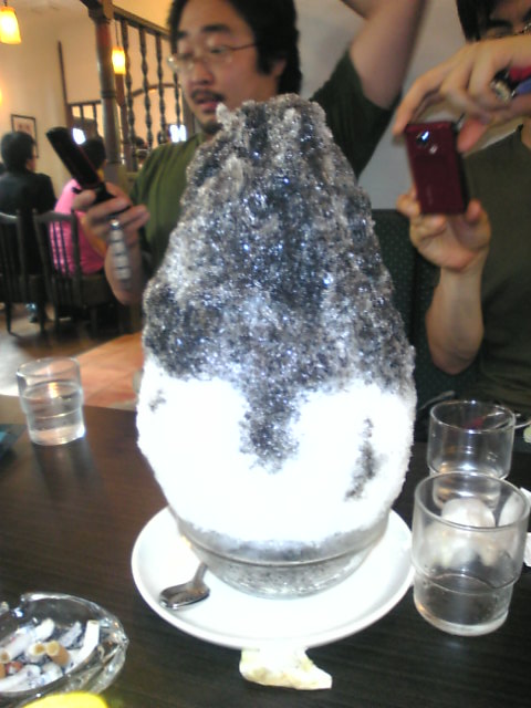 名古屋で有名なマウンテンです 写真はそこで頼んだイカスミカキ氷です。 見た目のインパクトがすごかったですけど イカスミそのものは無味なんですね。 味は普通のみぞれでした。 中心にバニラアイスの層がありました。 おいしかったです。