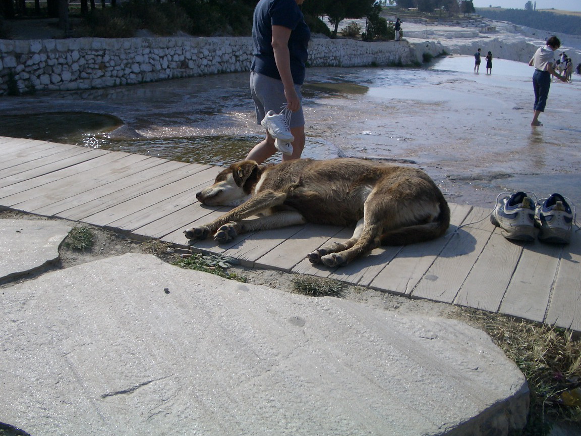 トルコの超有名観光地パムッカレにいたワンコです。 耳にタグが付いていたので飼い主さんが近くにいるんだと思いますが、アッパレなくつろぎっぷりです。