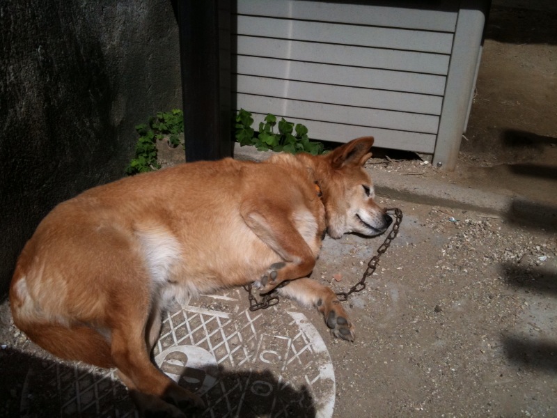 隣家のわんこです。 暖かい日はいつもこんな感じ。 うちの家族が通ってもまったくほえないのですが 知らない人が来ると突然ほえまくる賢いやつです。