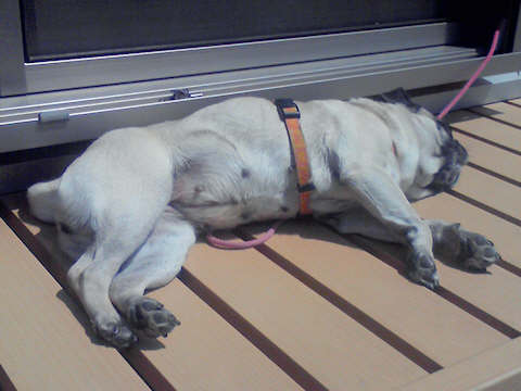 親戚宅のパグです。 春の晴れた日に縁側に出したら、ゴロンッとなりました。