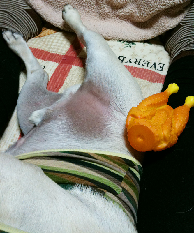 足の間で仰向けで爆睡する腹・・・ オモチャのチキンと同じでした。