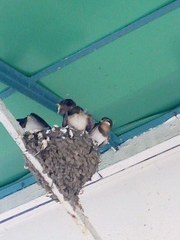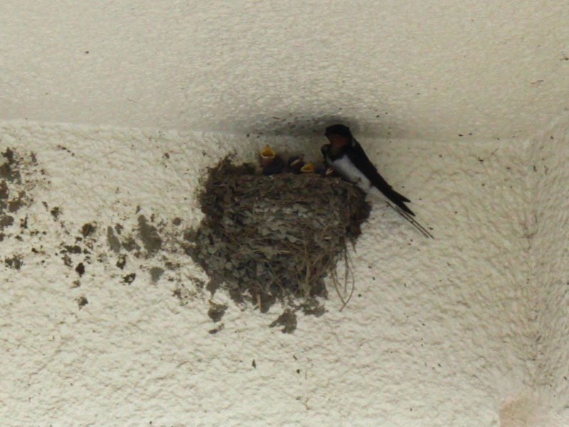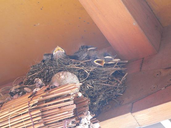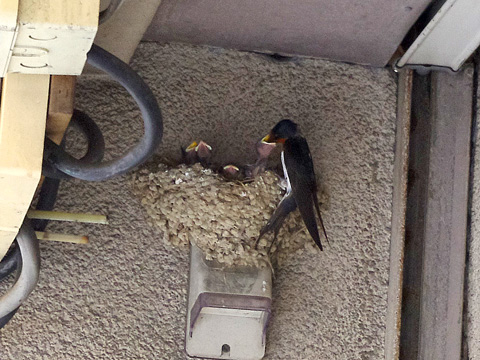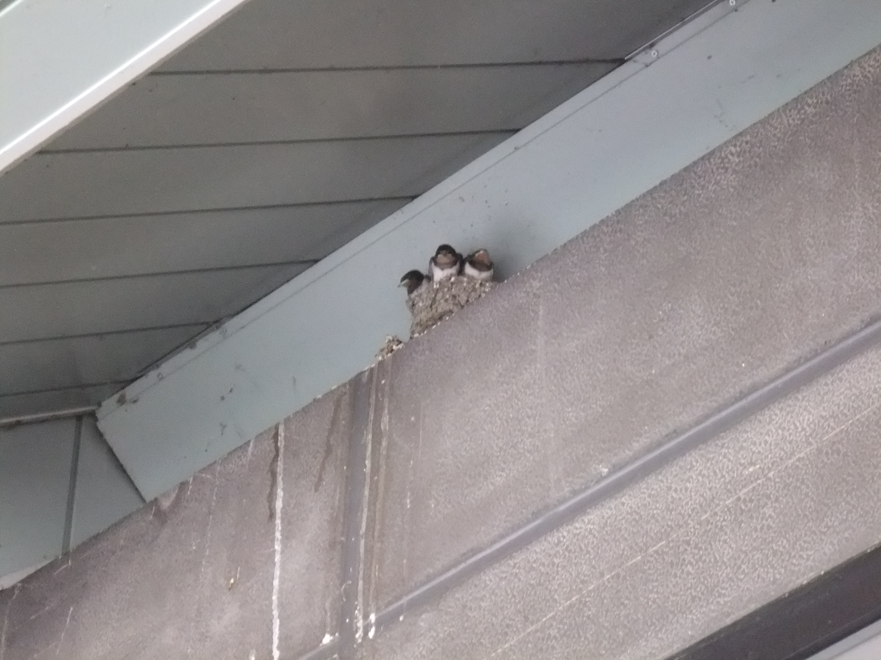 時々、低い方の巣の周りで、雛と思われるツバメが、こちらにお尻を突き出したり、見返り美人風に振り返ってみたりする仕草は、炎天下でも平気で居られるくらいに可愛いものでした。