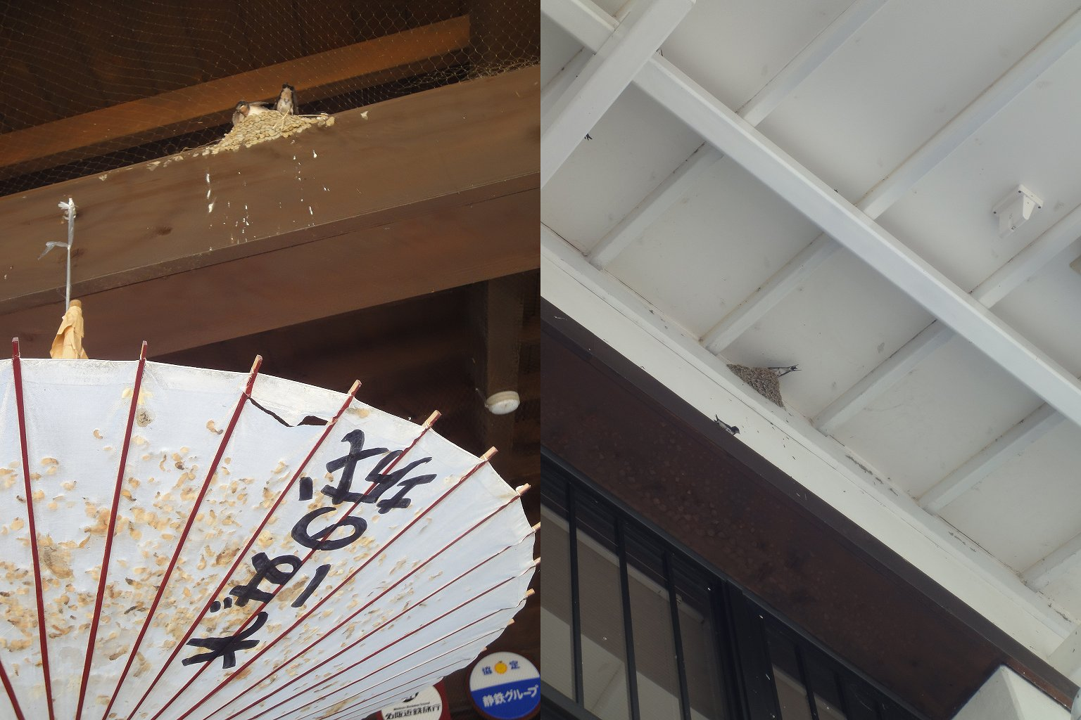 左写真は、そこそこ低いので和傘で糞が落ちない様にフォローされていましたが、右写真の方は高過ぎてフォローしようが無かったらしく、そのまま放置になっておりました。でも壁沿いなので、余程の事が無い限り、人には当たらない感じなので大丈夫だったのかと…