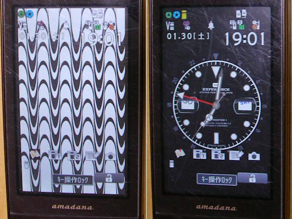 当方の携帯、普段は右の待受FLASHにしてるのですが、たまに勝手に左のような波模様に変わっていることがありました。 電源を入れ直すと元に戻るので、気味悪がりながらも一種のバグかな?と思っていたのです。 ・・・が。 たまたま何かの検索をしていて、数字キー長押し→エコモード→表示が乱れるという記述を見つけました。 うっかり長押ししてたんですね、トホホ…(´o`;A