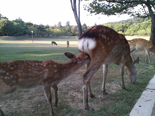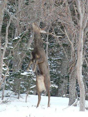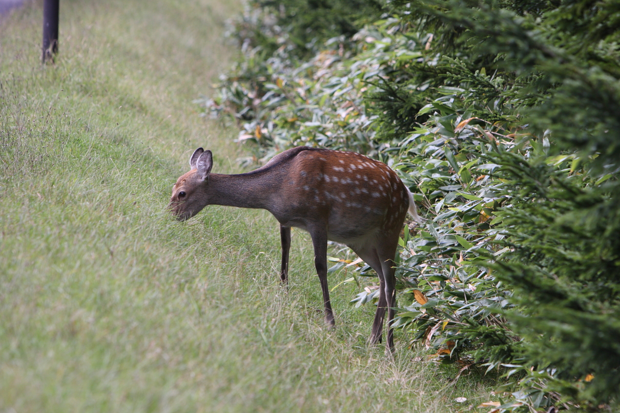 多くの場合は餌を求めて里へ下りてきてしまった鹿が国道脇の林にたたずんでいるといった感じで、鹿の方が人間の生活圏に侵入してきているんですが、