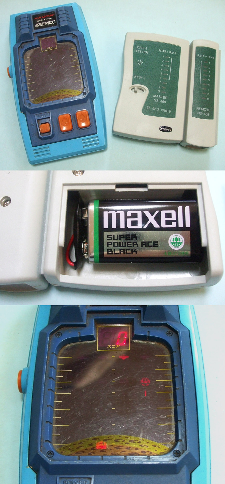 もう一つは大昔のゲーム、バンダイ・ミサイルインベーダーです。以前片付けで出て来たのですが捨てるのが惜しくなり取ってありました(汚れててごめんなさい)。入っていた電池が液漏れして酷いことになっていましたが、新しい電池を入れてみたらまだちゃんと遊べました。無駄に電子音がデカい。