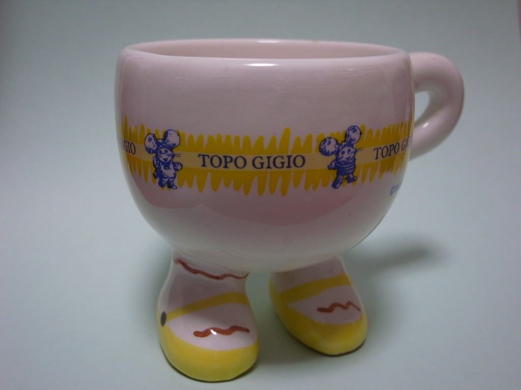 デパートのイタリアフェアで変わった形に一目惚れしたトッポ・ジージョのカップです。 一時愛用していましたが、ドリンクを入れるとすごく不安定になり母に捨てられる所だったので部屋に飾っています。形と足下の茶色の靴下のラインが気に入っています。