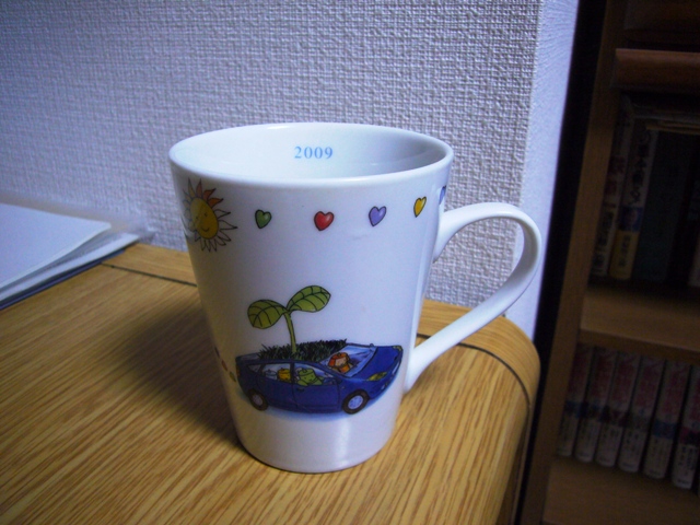 二年前,プリウス買った時(一つ前のモデル)貰ったマグカップです.広島トヨタ限定品.毎日,焼酎のお湯割り入れてちびちび呑んでます.