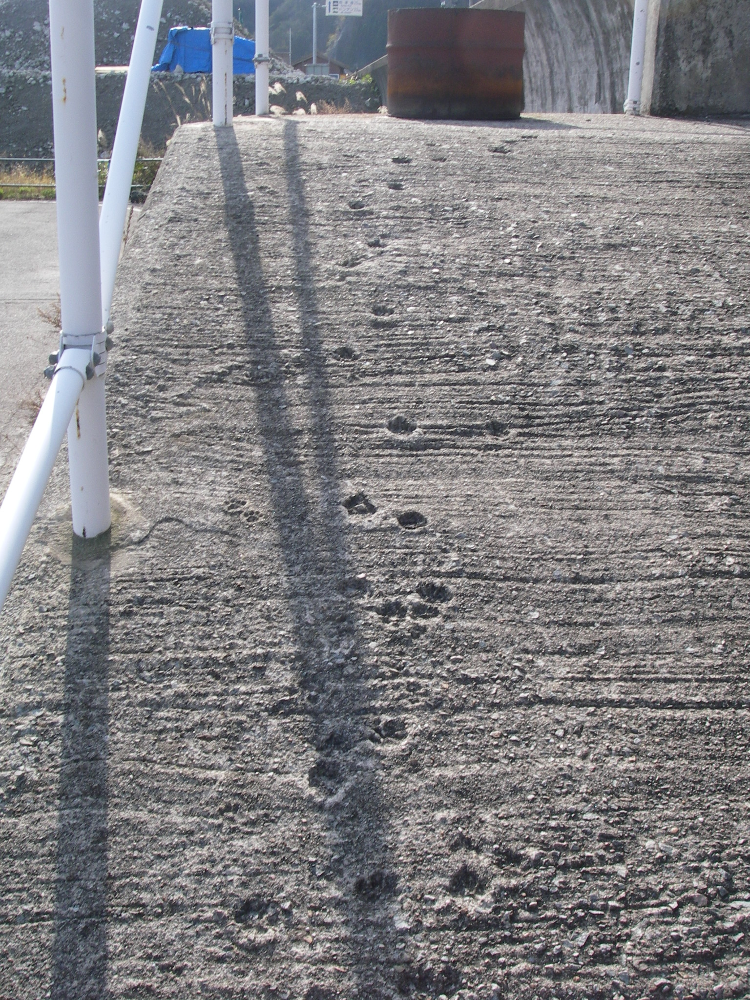新潟県・佐渡の「北小浦」です。ダイビングでは超有名なポイントです。そこの、海沿いの道路から港に降りるスロープのコンクリに猫の足跡がのこっております。猫は数回もしくは数匹通ったと思われるのですが、それを修復せず、そのまま固めてしまった地域の人のおおらかさに、このスロープを通るたびにニンマリしております。