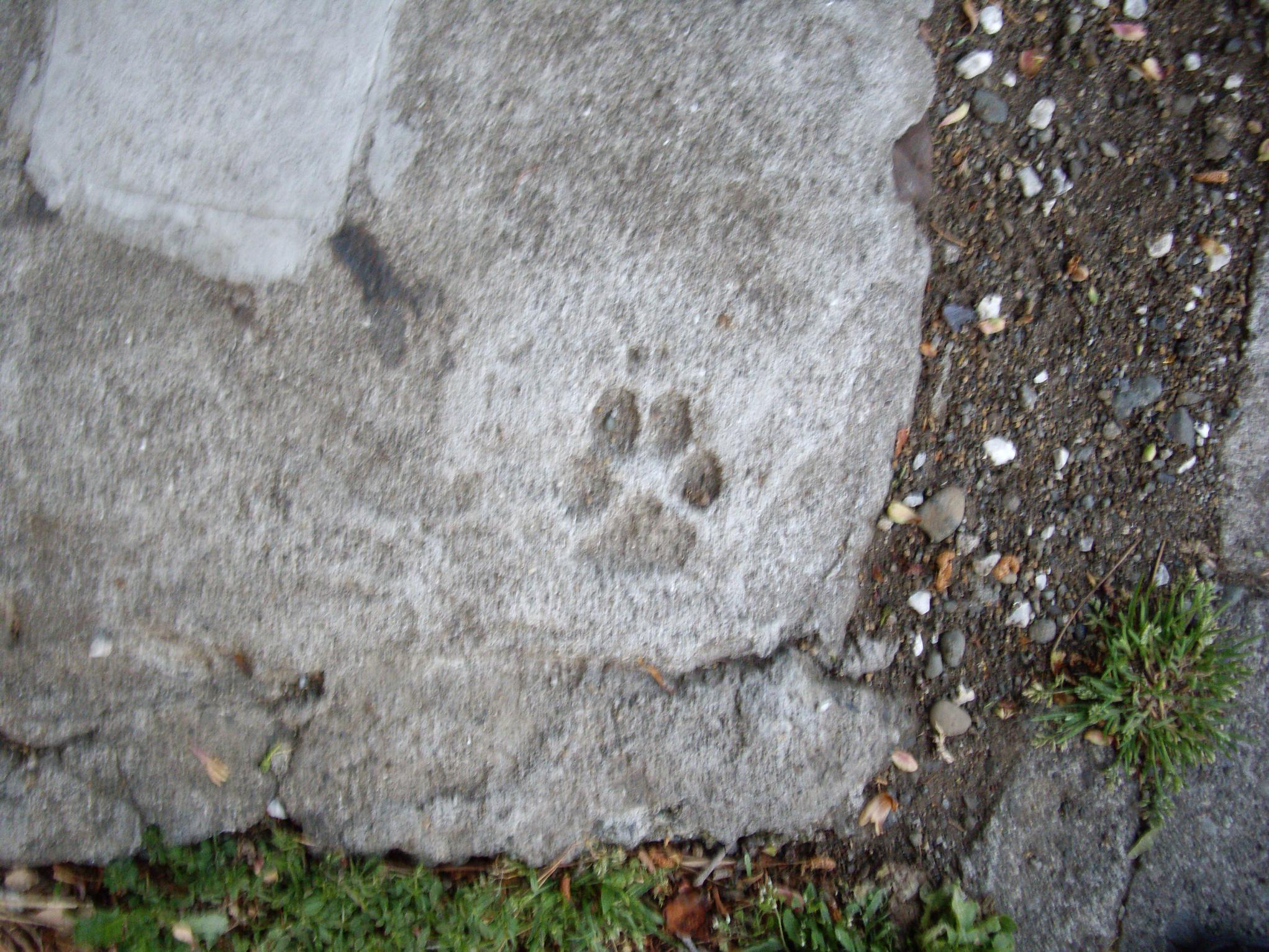 電柱の根元です。 写真がヘタで見づらいですが、猫らしい足跡がいくつか残ってます。 生乾きのコンクリは、あえて歩きたい心地良い感触だったのかな?とほっこり。 仕事で落ち込んで俯いて歩いていたからこそ、見つけられたのかもね。