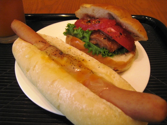 仙台の服部コーヒーさんのベーカリーカフェ「デリーナ」です。ハンバーガーはなかったので、ハンバーガー屋さんのメニューにあるテリヤキチキンサンド(写真奥)でご容赦下さい。