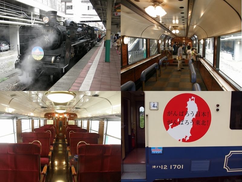 本来「SLばんえつ物語号」として新潟〜会津若松間を走っている列車ですが、7月末の大雨被害をうけ、この8月の土日、運転可能な馬下駅まで走っています。 レトロ調な客車や展望車が有り、乗車区間が短いものの楽しい列車です。