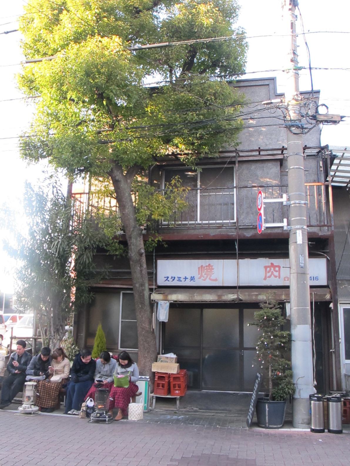 どんな有名人でも予約を取らせないで有名な焼き肉屋です。 17時オープンだと思うんですが15時位からこうして並んでます。 店を見せたくてストーブが小さくなってしまいましたが、 アラジンのブルーフレームが白黒並んで足元を暖めてます。