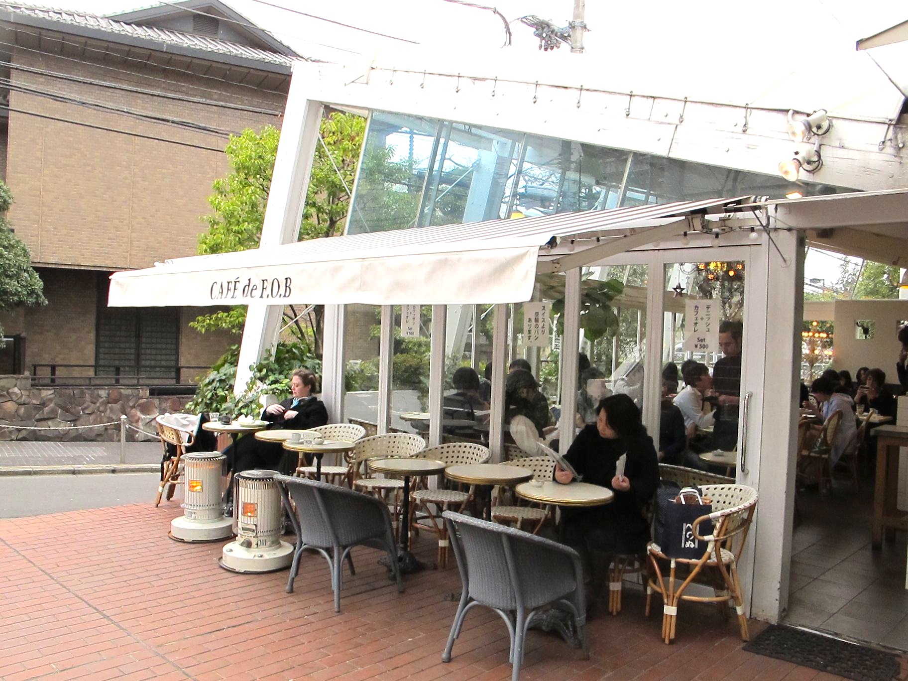 原宿ラフォーレ裏のオープンカフェです。 コロナ?の大型ストーブが二つ並んでますが、 どうせならもう少し間隔空けたほうがいいと思います。 手前の女性が寒そう。