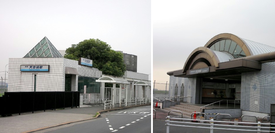 環八通りを穴守稲荷から海老取川を渡るとすぐにモノレールと京急線の「天空橋駅」があります。互いに地下駅となっていて入口のみが地上にあります。旧駅名は「羽田駅」で京急線が延長して羽田空港駅を開業した際に近くの海老取川に掛かる天空橋から名前を取って命名されました。辺りは開けた景色で後ろのフェンスの中は羽田空港の敷地になり、付近には警視庁空港署の天空橋交番以外にはなにもありません。
