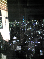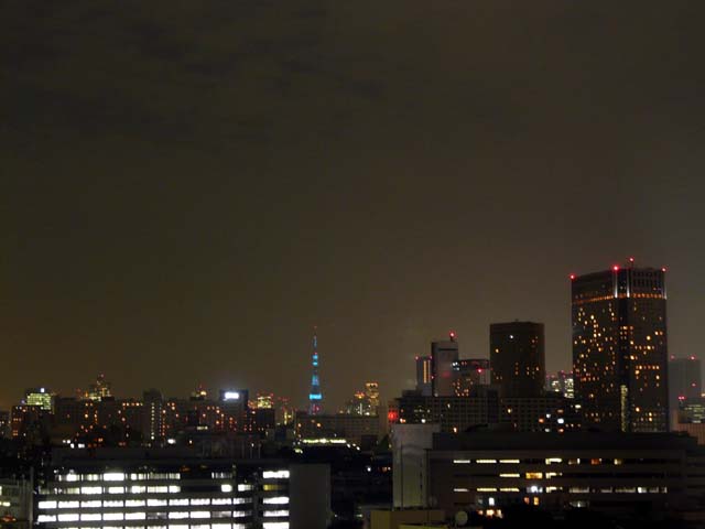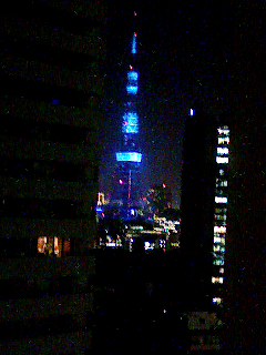 確かに青かったです。写真を撮ったフロアが明るかったので、ガラスにフロアが写り込んで見えにくいですが、真ん中上ら辺の青く光っているのがタワーです。