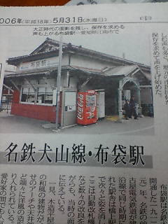 こちらは、古知野商店街の近くの布袋駅の記事です。駅の建物を、建て替えるという事で、存続させてくださいという記事です。 一緒にここも見てきました。 味のある駅でしたね。 2008年現在は、どうなったかわかりませんが・・・。 2006.5.31中日新聞記事