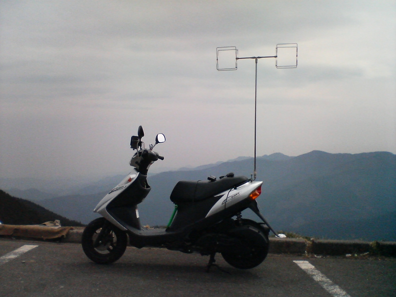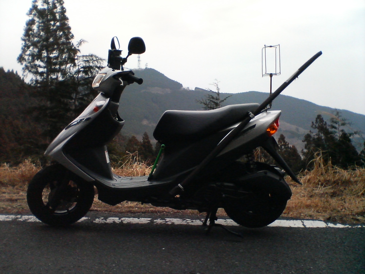 バイクの向こう側に鉄塔がある山がおたずねの堂平山です 写真は2006年3月頃のものです (バイクがジャマで申し訳ないです)