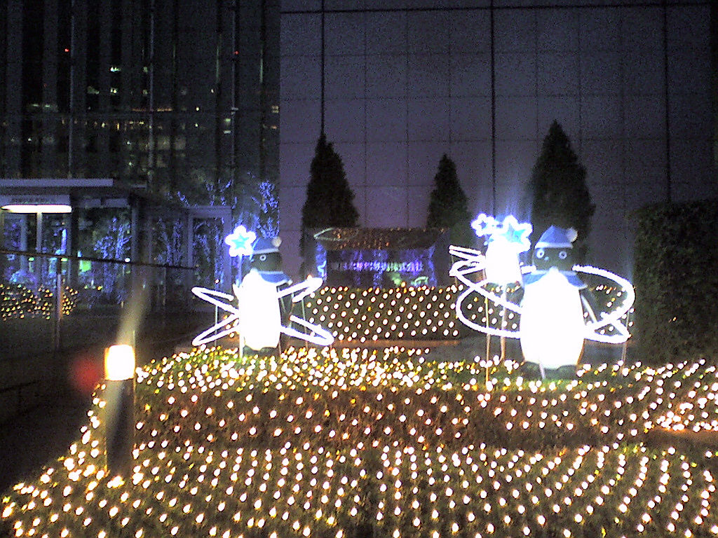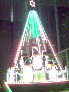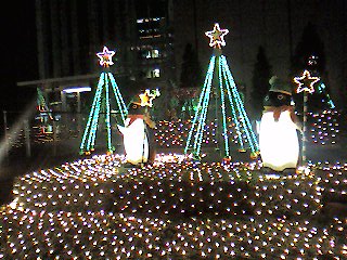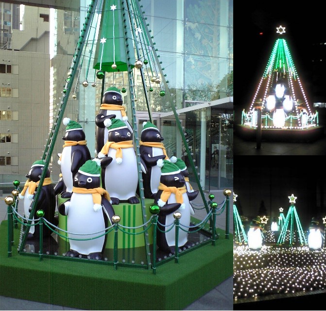 かわいいですよ! たぶん2月14日までだと思うのですが、 ぜひ早めにツリーのたくさんペンギン&反対側の3ペンギンに 会いに行ってください。 楽しみを取っておくために、ツリーの写真は止めて 反対側のペンギンの写真をアップしておきますね。 夜のライトアップもかわいいのですが、 ツリーの前にロープが張られてしまうので 接近するなら昼がお勧めです。