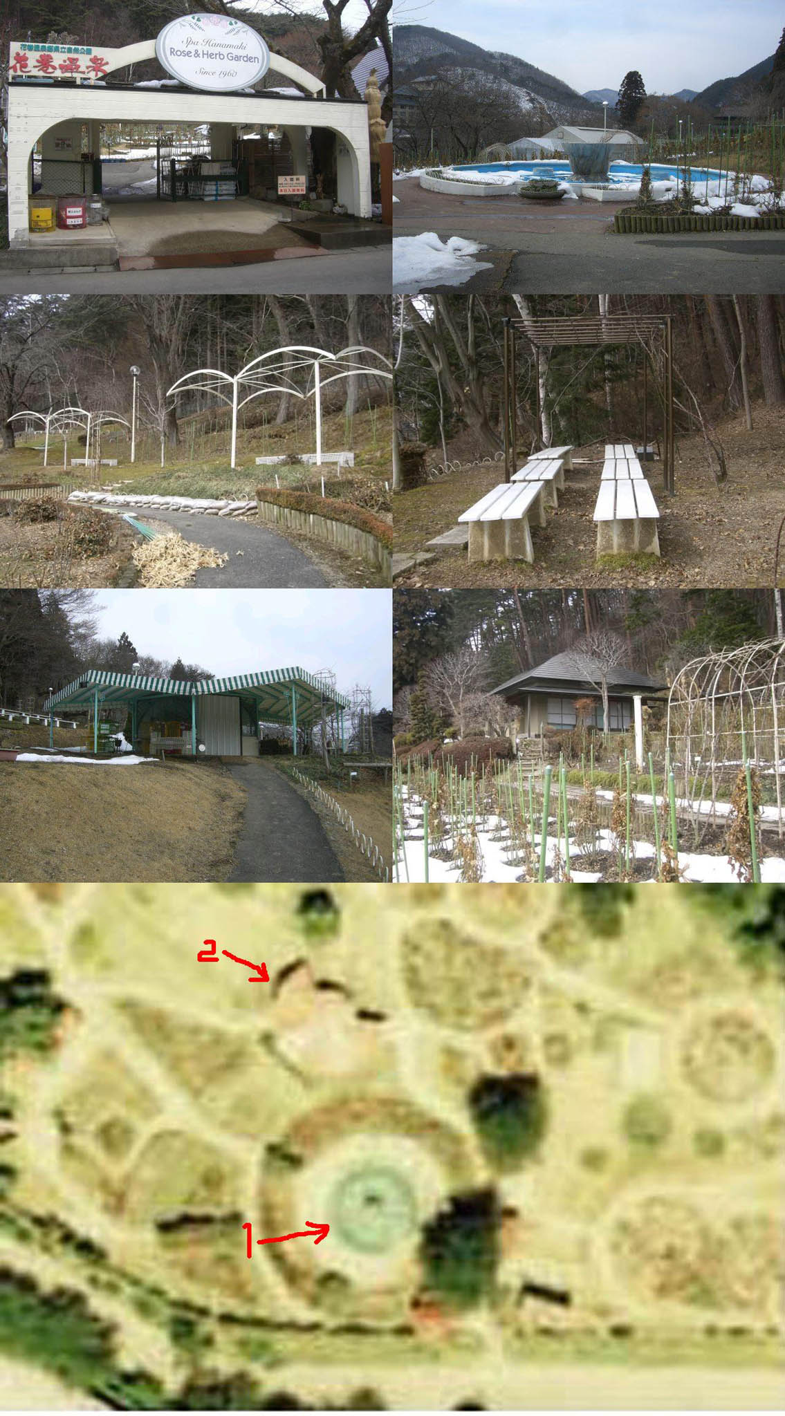 3月10日に見てきたのですが、現在ローズガーデン内に東屋と呼べるものはないようです。 今の時期、シーズンオフのため園内は誰もおらず、池の水も抜かれていました。 池の近くに休憩所?のような建物がありましたが東屋風の造りではありません。しかし、昭和51年の航空写真を見ると、ここが一番東屋のように見えました。 写真の説明 左上:ローズアンドハーブガーデン入口 シーズンオフのため入園無料でした。 右上:水を抜かれた池 左中:シーズン中はテントが掛けられて休み処? 東屋ではない。 右中:同上 左下:池のそばの休憩所 もしかしたら、ここが東屋だったのでは? 右下:園内にあった「癸亥庵」という茶室 ここかなとも思ったのですが、30年前には無かったよう です。 下 :昭和51年の航空写真 「1」が池で、「2」が休憩所と思われるが、休憩所が現 在と異なり、東屋風の屋根に見える。 もし、思い出の場所がここだったら、今は写真左下のよう になっています。 *航空写真 「国土画像情報(カラー空中写真) 国土交通省」の「撮影:昭和51年、撮影場所:花巻、整理番号:CTO-76-6、コース:C31、写真番号:14」より出展
