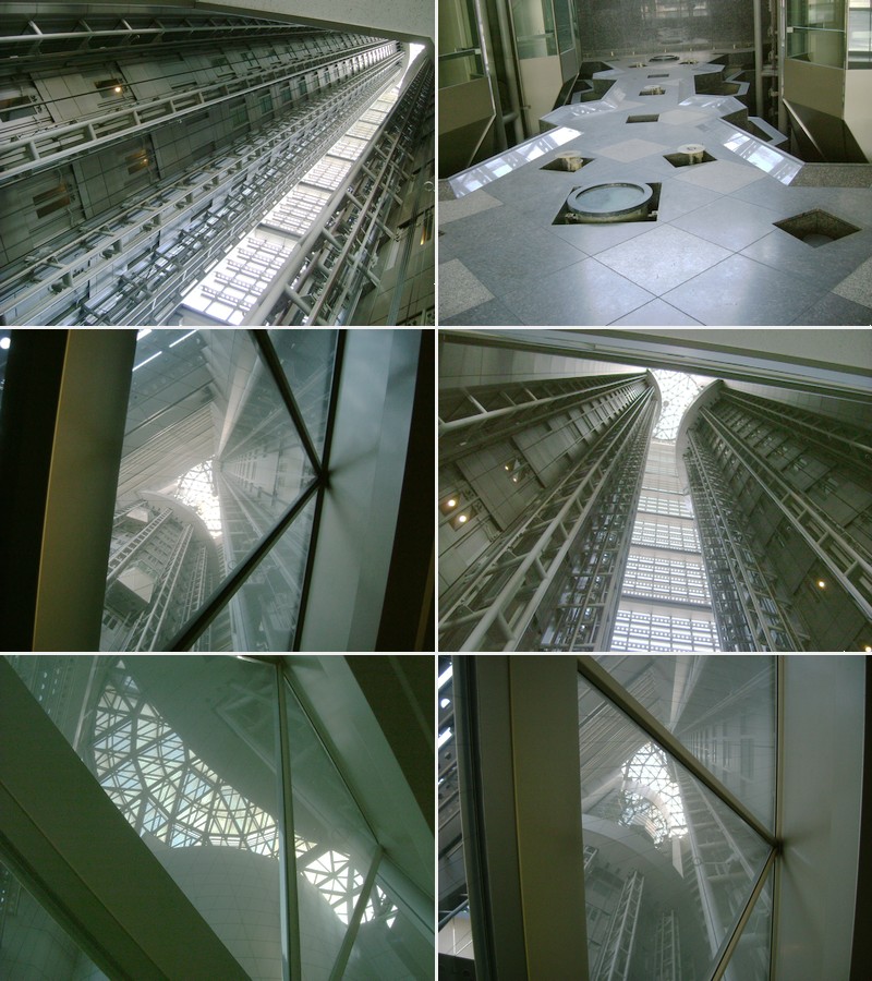エレベーターホールが吹き抜けになっており、エレベーターもガラス張りなので、慣れないと怖い感じの構造です。 右上から左下の順で見てください。 エレベーターホールの床のドーム真下は噴水になってますが、今は使われていません。 見上げるとシャフトが伸びています。(真下には入れないんで腕を伸ばしてセルフタイマー使って撮りました) エレベーター内部から上昇中に連続写真。空と雲がガラス越しに見えます。