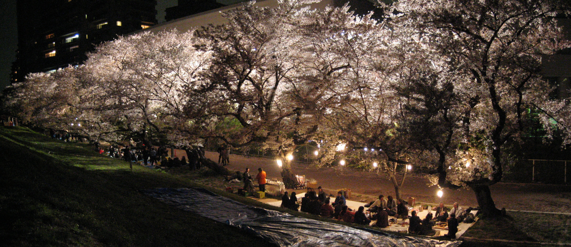 ガス橋から上流、スーパー堤防に作り変えられた部分は土手上に桜並木が続きますが、東京高校の付近はまだ土手下に桜が並んでいます。いずれ堤防改造が行われ、この桜の大木たちも移植されるのでしょうか?今のところその気配はありませんが。 昨年の4/6に通りかかった際、盛大に催されていた夜桜宴会を土手上から撮った写真がありましたので添付します。地図で「創価学会」となっている建物がある裏手です。
