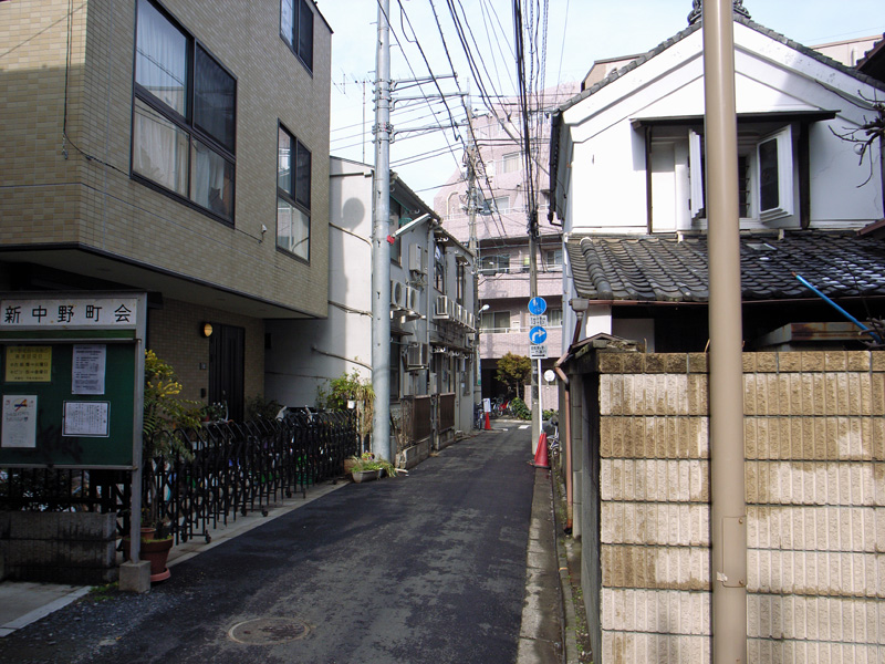 ご指定の住所に行ってきましたが、『松井荘』というアパートを見つける事はできませんでした。 写真に写っている道路は、新中野駅の荻窪寄り出口付近から続く道で、突き当たりは少し広い道です。道路の左側が中央4丁目6-26で、この住所を表示したアパートは何件かありましたが『松井荘』という名前はありませんでした。 住宅街なのであまり堂々とカメラを構える訳にはいかず、写真はこの1枚しかありません。 見覚えのある建物はありますでしょうか。