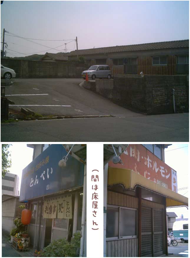 上が駐車場(元定食屋?)です。 下は国道沿いに並んだ3店舗のうち2軒を撮影したものです。 北から焼肉店・美容室・お好み焼き屋がつらなり、角の焼肉店は駐車場に隣接しています。 お好み焼き屋さんで「小さな定食屋」のことを尋ねようかとも考えましたが、その存在時期がはっきりしないため止めました。 ちなみに国道からですと焼肉店・件の駐車場・民家・新聞配達所、道を挟んで公園となります。