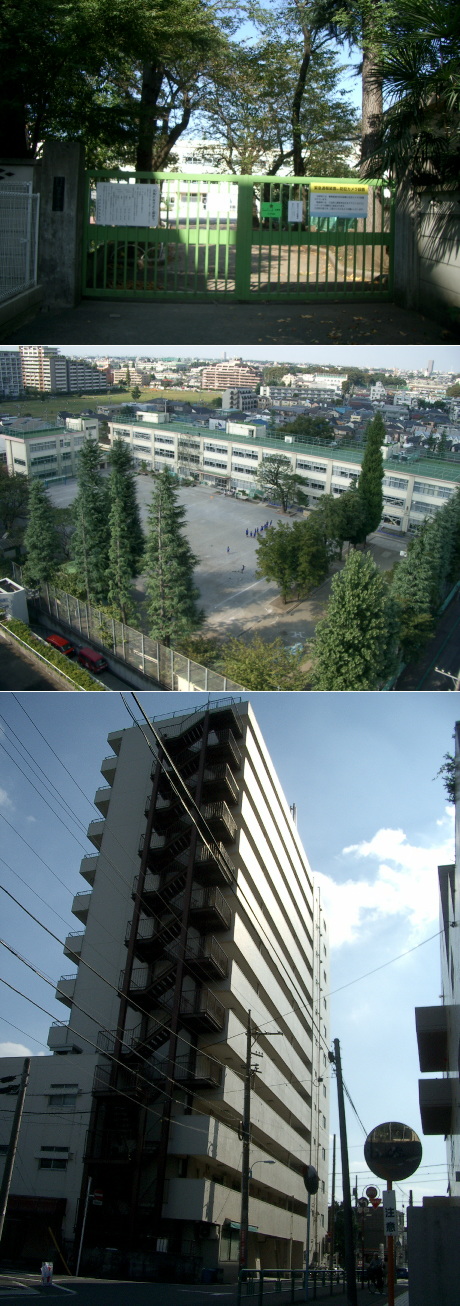 祝日でしたが校庭ではサッカーをする子ども達が元気に走ってました. 写真は1枚目が青梅街道から直結した正門(?)で,2枚目がニュー荻窪マンション12階から撮った全景,3枚目が学校側から撮ったニュー荻窪マンションです.