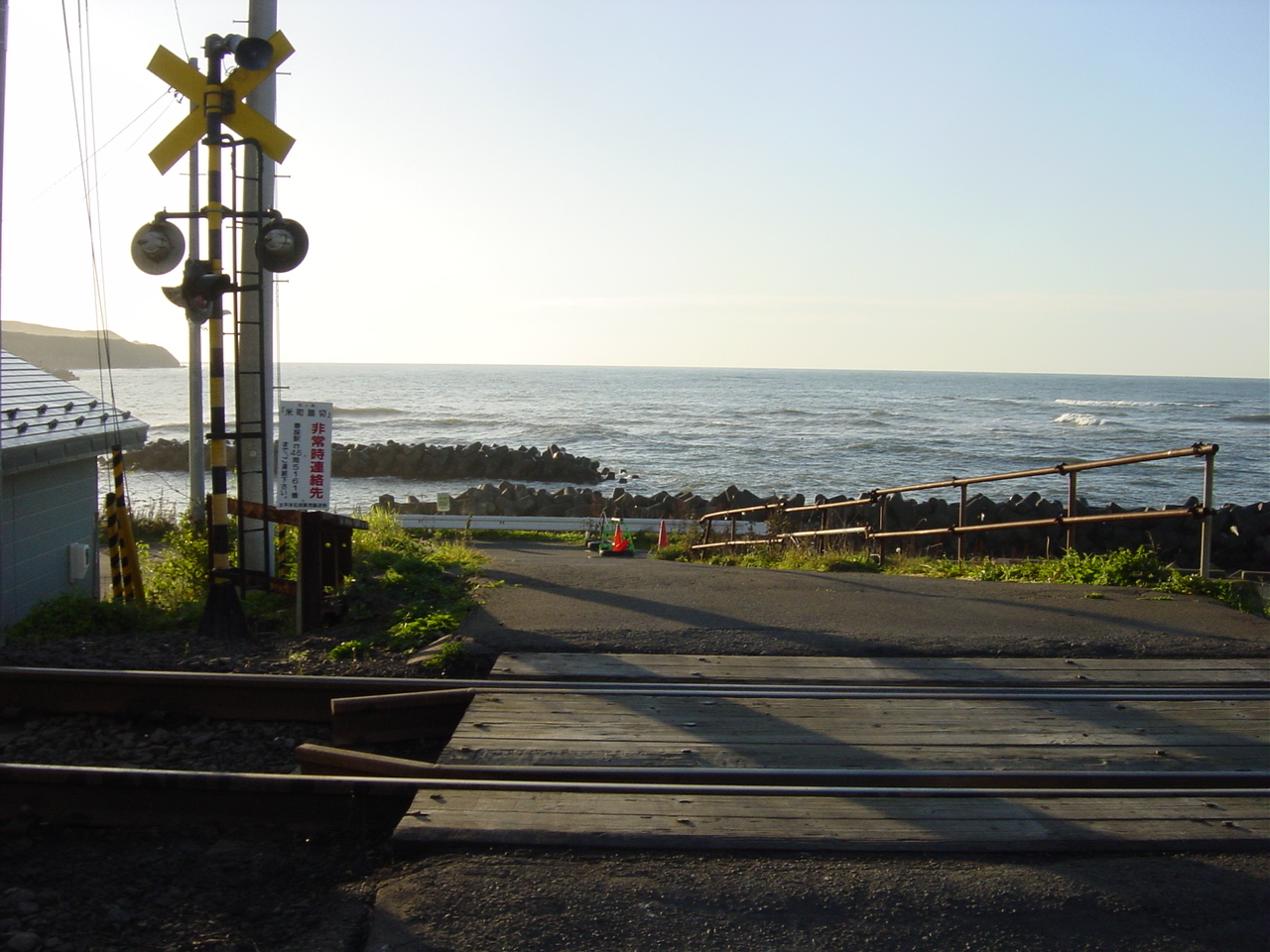 そうすると、下り坂の向こうに雰囲気のある踏切と、