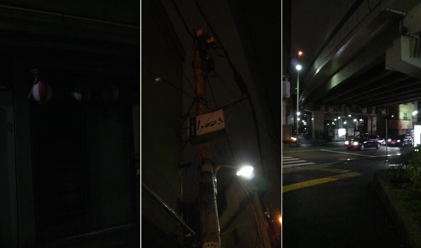 写真が暗くてすみません。 平日の夜7時頃見てきたのですが、お店は営業されていませんでした。 貼り紙など全く無かったため、たまたま定休日だったのか長期的に休業されているのかちょっと分かりません。 きれいなちょうちんが掲げられているので閉店はされていないと思います。 今度もう一度見てきます。 左から順にお店の入り口、建物の二階あたりにある看板、恵比寿三丁目交差点からお店の方向を撮った写真です。