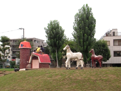 かき氷を売っているところが二件あったのですが 屋台のお店は見つけられませんでした。 凄く楽しい公園で、あそこで青春を過ごせたぬこさんが うらやましくなりました。 写真は萩中牧場で育っている馬と人間です。 詳しくはこちらをごらんください。 https://backnumber.dailyportalz.jp/2009/09/01/a/